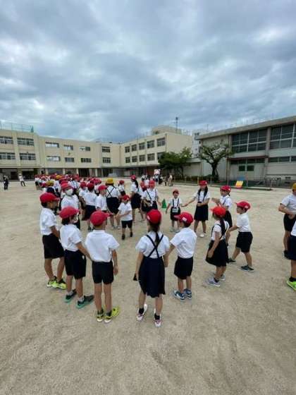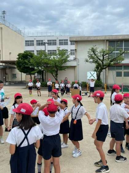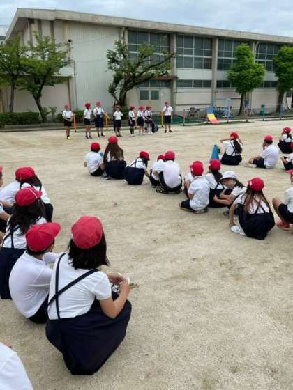 運動場で「たてわり班」ごとに並び、遠足に関する問題を協力して解きました。