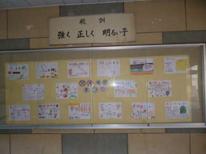 あすの「加美南部まつり」の各学級の出店内容は次の通りです。どの学級も子どもたちが一生懸命準備に取り組みました。写真のように玄関左側の掲示板にポスターを掲示しています。