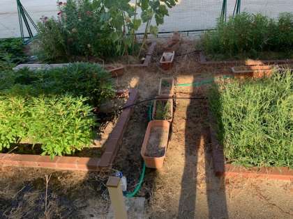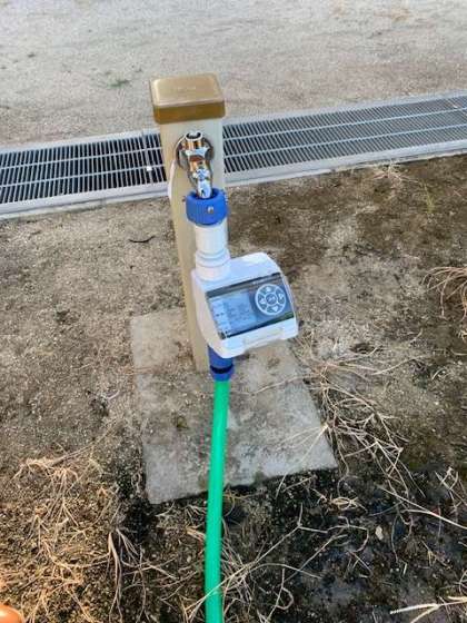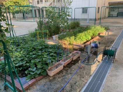 事務職員さん、管理作業員さんにお願いをして学習園に定時セットすると水を自動で撒いてもらえる「自動散水機」を夏休みに設置してもらいました。
