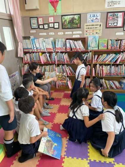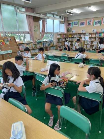 読み聞かせや自由読書など、思い思いに読書活動を楽しんでいました。本の貸し出しは係の児童がPCを使って行います。