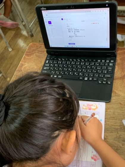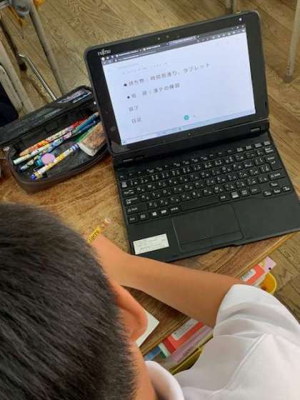 多くのクラスで、タブレットに連絡帳を確認するようになりました。子どもたちが見て書き写す力も必要なので、連絡帳に写していきます。
