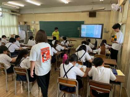 教育実習生の2名が教科担任の先生の学習を見学しています。
