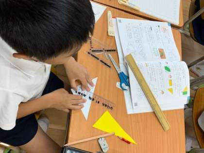 長さを比べようと三角形の辺の長さをものさしで測って調べていきます。