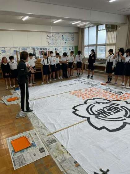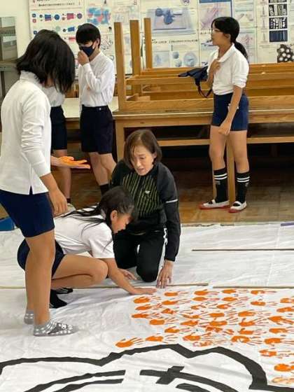 創立80周年を記念して、全校児童の手形が入った布製掲示物を作ります。まずは6年生の手形から押していきます。
