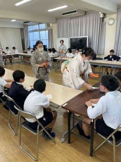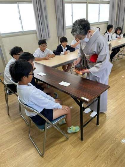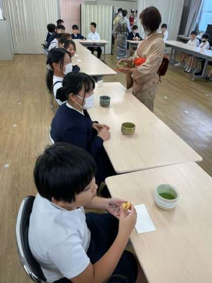 地域の方々をゲストティーチャーに招き、茶道の体験を行いました。和菓子を食べた後で抹茶をいただいた5年生。「少し苦かった。」と言う児童もいましたが、貴重な体験となりました。