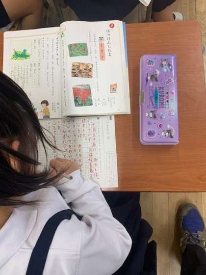 「はっけんしたよ」という単元で、身の回りのものを友だちに伝えるために文章を書いています。