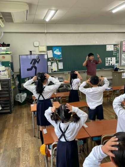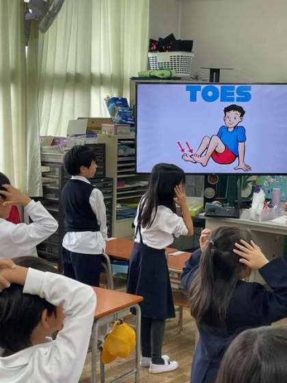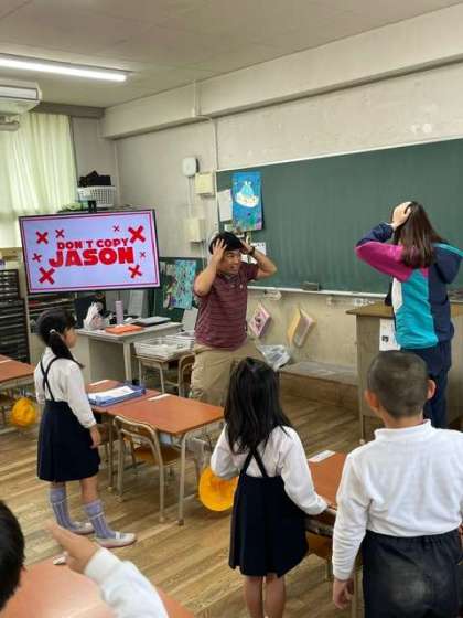 C-NETのジェイソン先生と一緒に楽しくアクティビティを行いました。歌ったりゲームをしたりしながら学習できるので、みんな笑顔で活動していました。