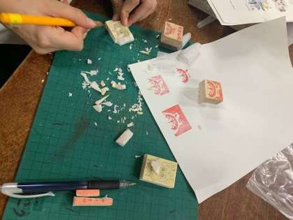 今日は、他校から講師の方をお招きして、若手の教職員を中心に「消しゴムハンコ作り」を学びます。