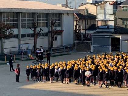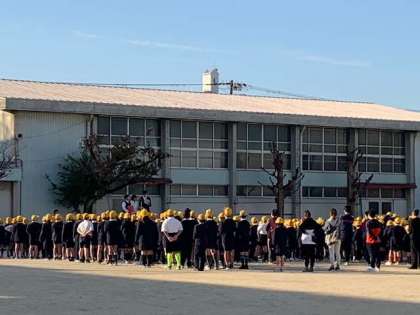 月に一度は、全校が運動場に集まって朝会を行います。