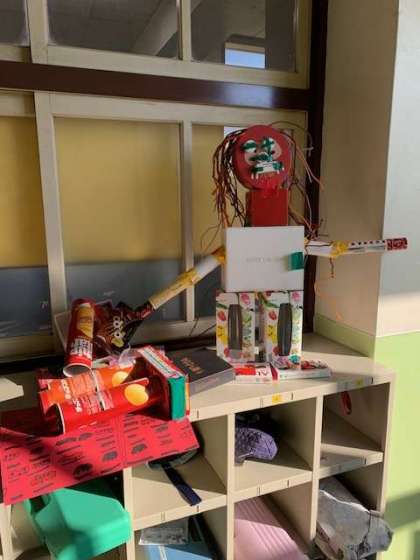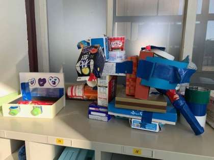 箱で作ったアート作品が、見られます。作っていた時間には、出会えなかったですが、なかなかの力作です。