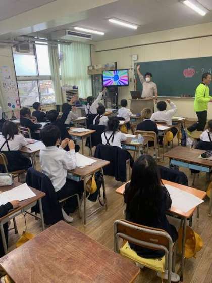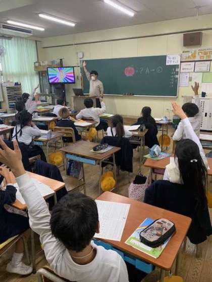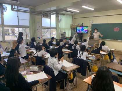 アルファベットを確認しています。すごく元気のいいクラスで、よく手が挙がります。