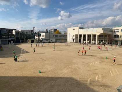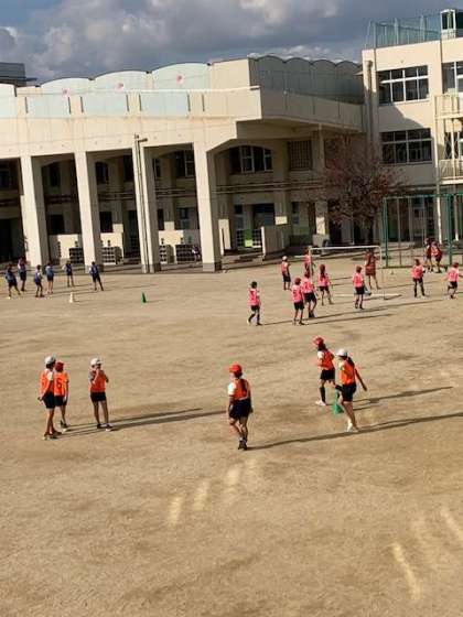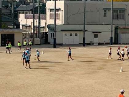 学年でサッカーに取り組んでいます。チームで練習したら、試合開始です。