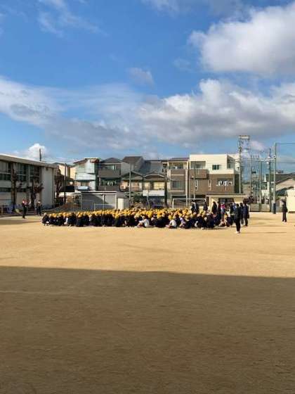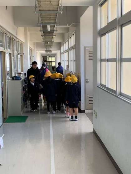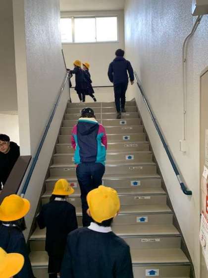 一度、運動場に避難した後は、三階の教室まで全員で上がります。