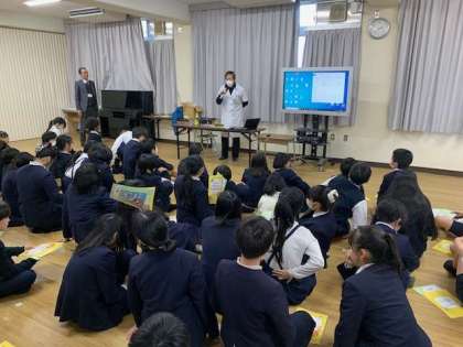 学校薬剤師の方に講師に来ていただき、6年生に薬の正しい使い方や危険な薬、タバコなどについて教えてもらいました。