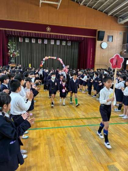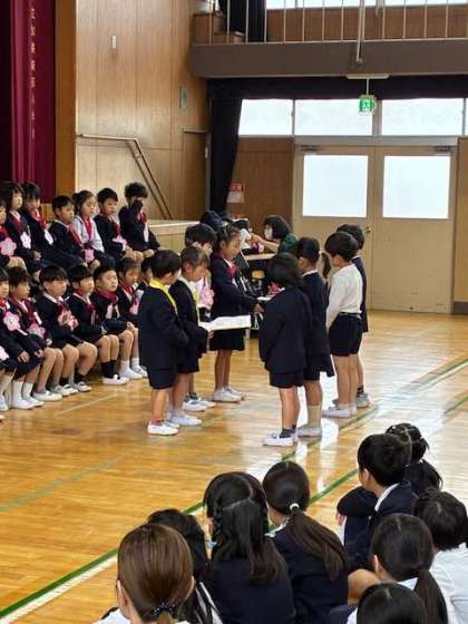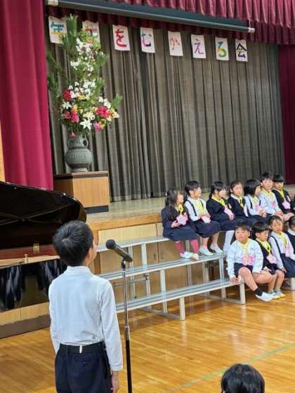 2年生からは「朝顔の種」をプレゼントされ、上級生が校歌を歌って紹介しました。