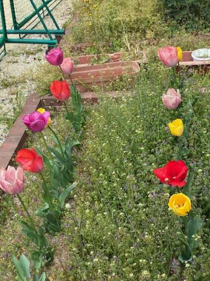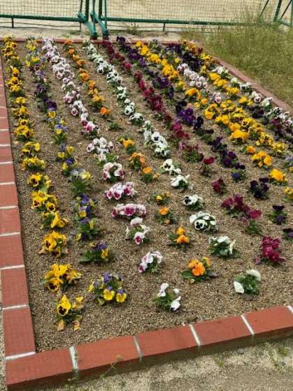 春まっさかり。学習園のパンジーやチューリップの花がきれいに咲いています。