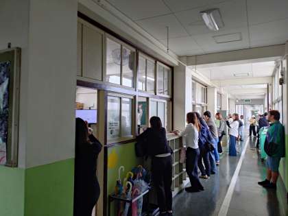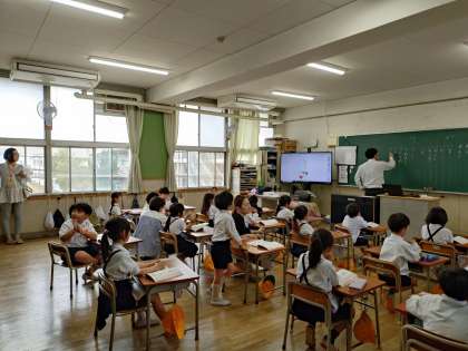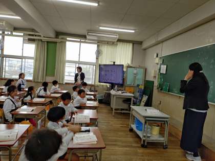 3時間目に1年生の授業参観を実施しています。たくさんの保護者の方にも来ていただいて、授業をしています。