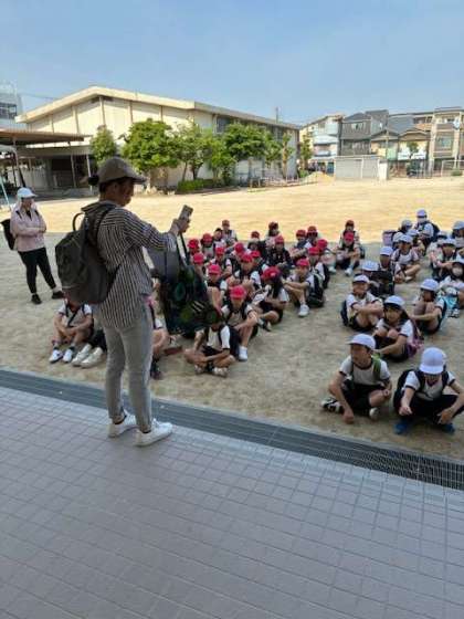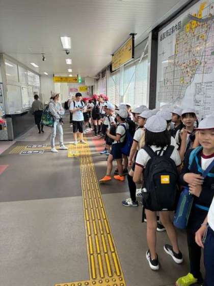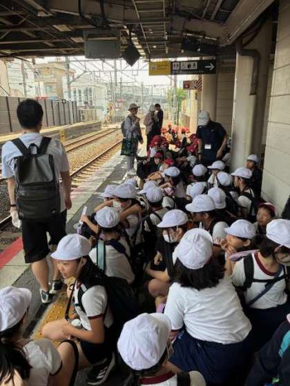 ?今日は5年生が鶴見緑地公園まで遠足に行きます。加美駅に到着し、これから電車に乗ります。