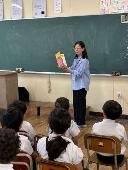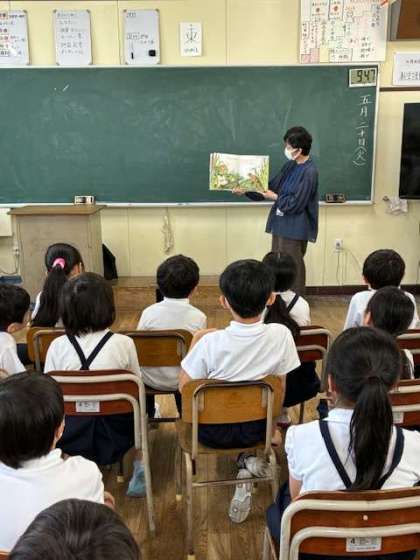 平野図書館の方に来ていただき、読み聞かせを行ってもらいました。低学年の児童の素直な反応が微笑ましかったです。