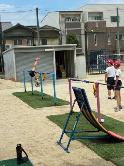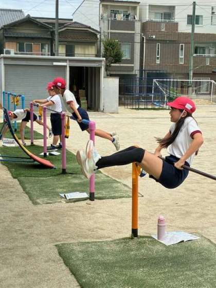 地面から逆上がり、鉄棒の上で連続逆上がりなどを練習しました。補助器具を使用したり、教科書のアドバイスを見たりしながらトライしました。