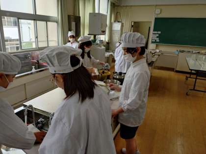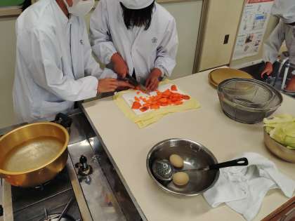 5年生が調理実習でゆで野菜サラダをつくっています。にんじんやキャベツを煮ています。