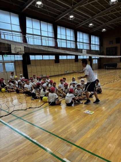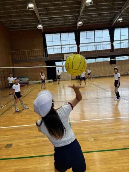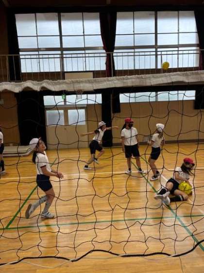 雨天と言うこともあり、講堂でソフトバレーボールをしていました。ボールが柔らかいので恐怖心なく取り組めるのが良いところです。