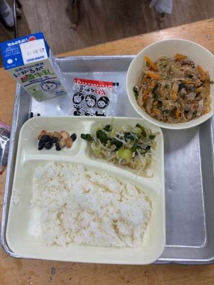今日の給食の献立は、麻婆春雨、チンゲンサイともやしの甘酢和え、いり黒豆、ごはん、牛乳です。1年生もマナー良く、美味しそうに食べていました。