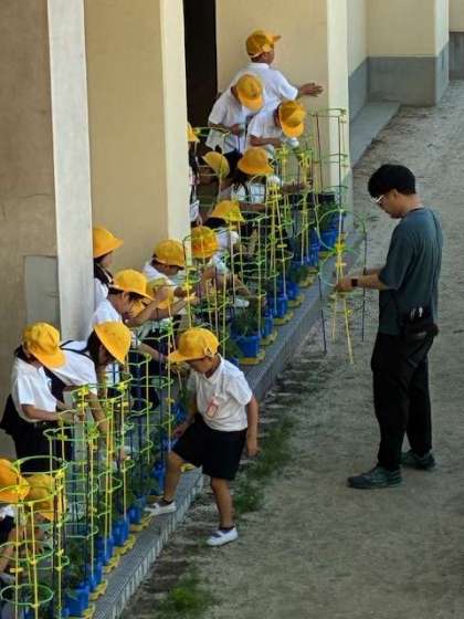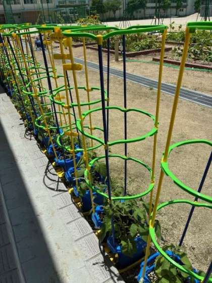 1年生が育てているアサガオが育ってきたので、支柱を立てました。今後も順調に育ち、立派な花を咲かせることを願っています。