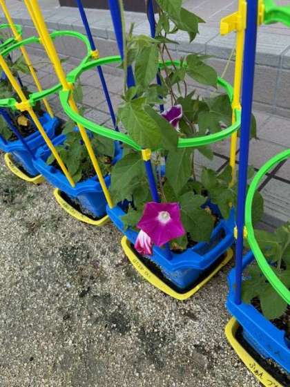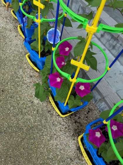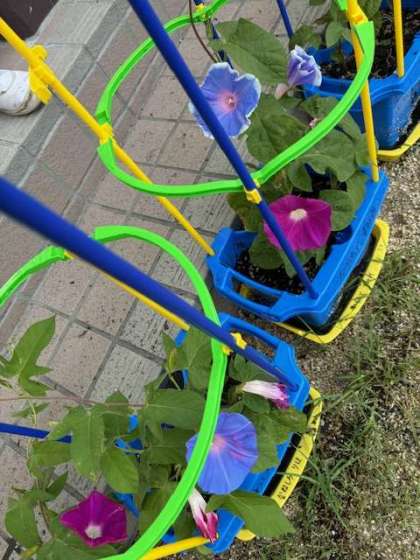 1年生が育てているアサガオの花が、色鮮やかに咲き始めています。「水やりがんばったもん。」と誇らしげに話す児童に出会いました。
