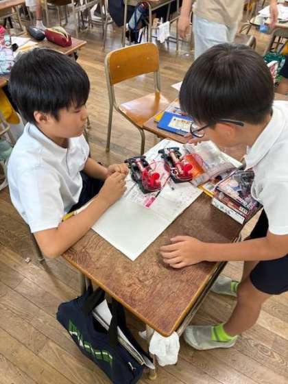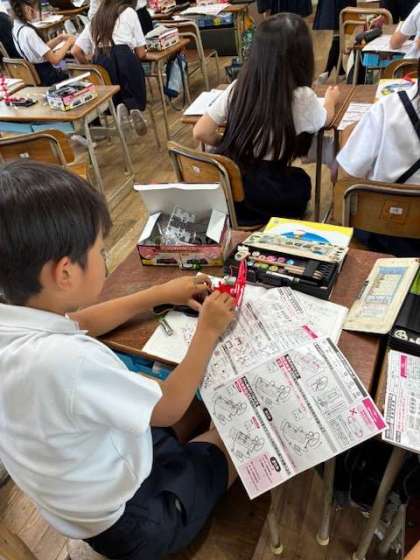 実験用具を使って、電池の数によってプロペラの回る速さが変わるかを確かめました。友だちと協力して実験しました。