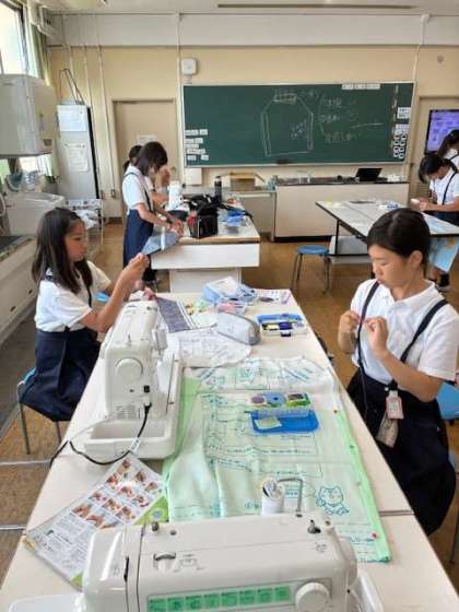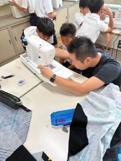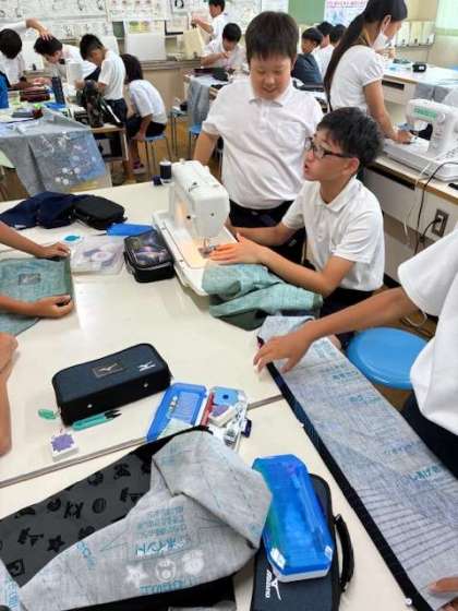電動ミシンを使って、紐を通す部分を縫う作業を行いました。今学期中には完成しそうです。
