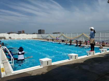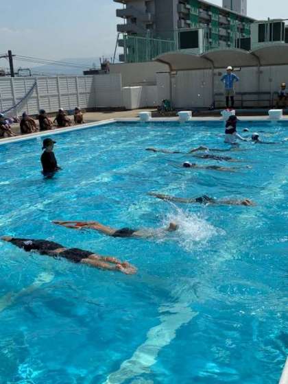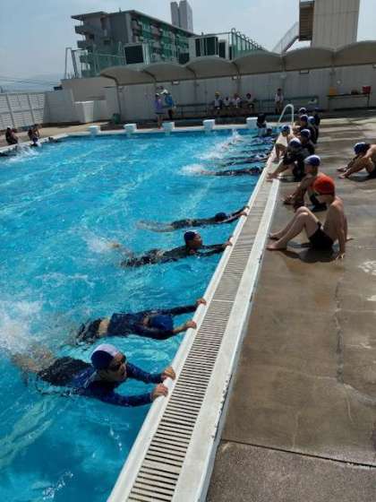 蹴伸び、バタ足をプールの横を使って練習しました。蹴伸びが全ての泳法の基本となります。