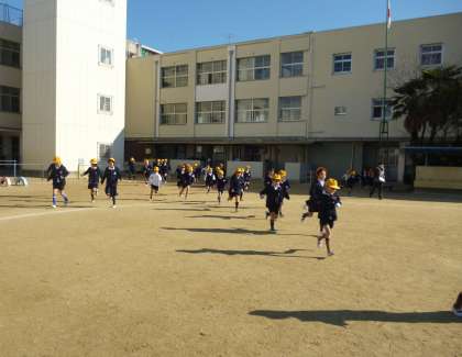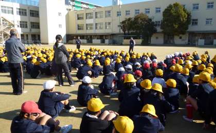 10時ちょうどに「地震が発生しました」の放送後、各教室で机の下に入ったり、火の元の確認や避難路の確保を行いました。そののち揺れがおさまったと想定して全校児童が運動場へ集まり、3分間ほどで全員の点呼を完了しました。