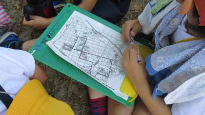 暑さに負けずに「ここ知ってる」「あっ私の保育園だ」などの声や、いつも通っている道で「こんなところに工場があったんだ」などの新しい発見も多かったようです。これからも色々なことを発見して地域のことを学んでいきます。