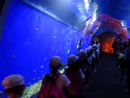 グループに分かれて、館内をゆっくり見学しました。普段見ることのできない海の生き物の姿を観察し、子どもたちは楽しそうに学習していました。サメやエイなどに触ることができるタッチプールでは沢山触れ合い、サメやエイの肌の感触に驚いていました。