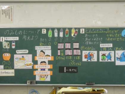 栄養教諭による食育の授業です。テーマは「のみものについて考えよう」でした。