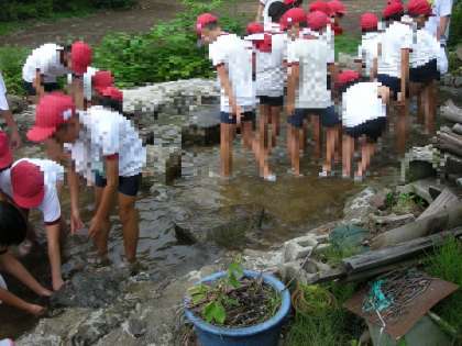 避難訓練後、体験活動(魚つかみ、焼き板みがき)が始まりました。