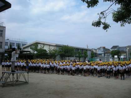 残暑が厳しいですが、全校児童がしっかりと整列し、話を聞くことができていました。