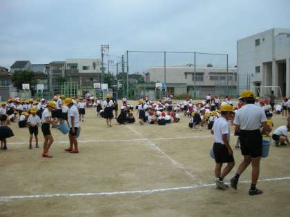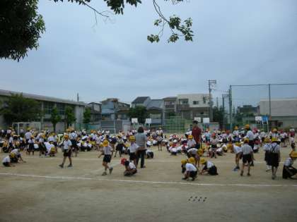 本日(9月4日)、全校朝会終了後、運動会に向けて、全校児童で運動場の石ひろいを行いました。