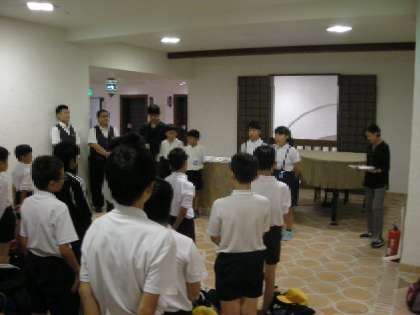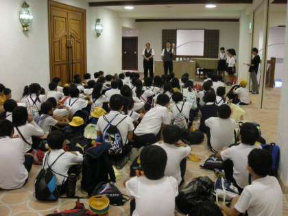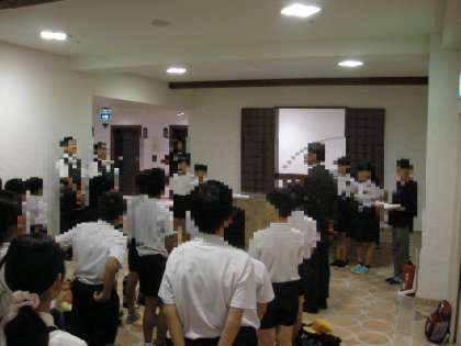 開舎式(学校長・児童代表のあいさつ、宿舎の方からの話)の様子です。「お世話になりますが、よろしくお願いします。」
