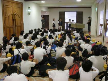 荷物整理、清掃後、閉舎式(学校長・児童代表あいさつ、宿舎の方からの話、連絡)を行いました。