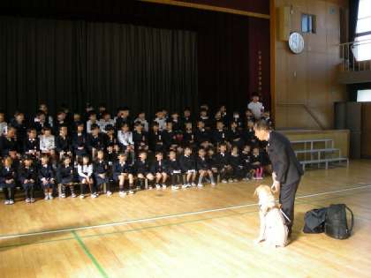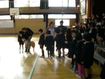 3年生の皆さんは、講師の先生より、盲導犬についてのお話を聞き、その後、実際に盲導犬と触れ合いました。貴重な体験となったようです。