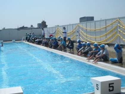 4年生の着衣泳の様子です。講師の方をお招きし、水の事故を防止するために、着衣泳に取り組みました。