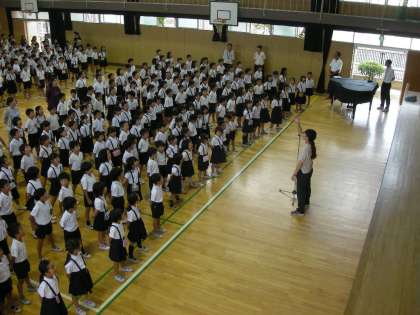 児童の皆さんは、おちついた態度で話を聞くことができていました。最後に、全校児童で校歌を合唱し、終業式を終えました。