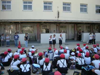 出発式の様子です。ルールを守って、みんなの力で思い出に残る楽しい林間学習にしましょう。