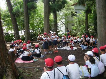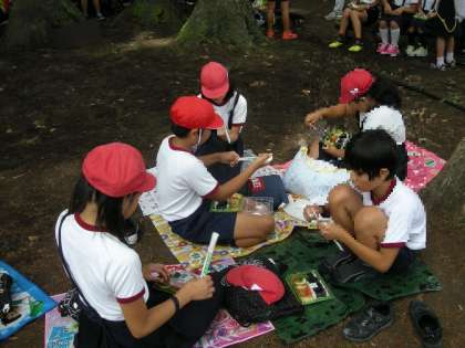 木陰で、班ごとにお弁当を食べました。メニューは、「おにぎり弁当」でした。