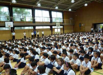 9月1日(月)、改修なった講堂(兼体育館)で2学期の始業式を行いました。校長先生から、「早寝・早起き・朝ごはん」の言葉で、生活のリズムをきちんと立て直すよう話がありました。式全体を通じて、子どもたちはどの学年もきちんと整列して話をしっかりと聞くことができ、校歌を元気よく歌うことができました。