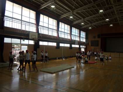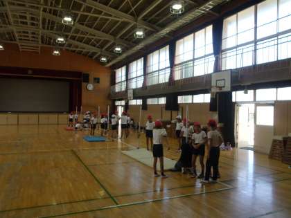 4年生は体育館で高飛びをしています。