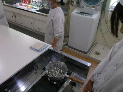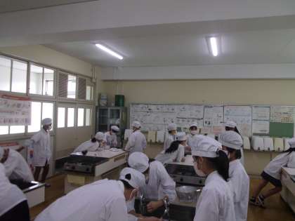 5年1組が調理実習をしています。ごはんとみそ汁を作っています。