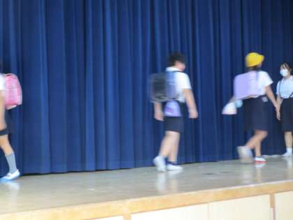 本日の朝の児童集会は、集会委員会による「何人が通ったでしょうクイズ」でした。講堂の舞台を横切って歩いていた人物の人数を当てるクイズです。服装や持ち物を変えて再登場するなど、出題者の児童が工夫していたので、みんな楽しく過ごすことができました。
